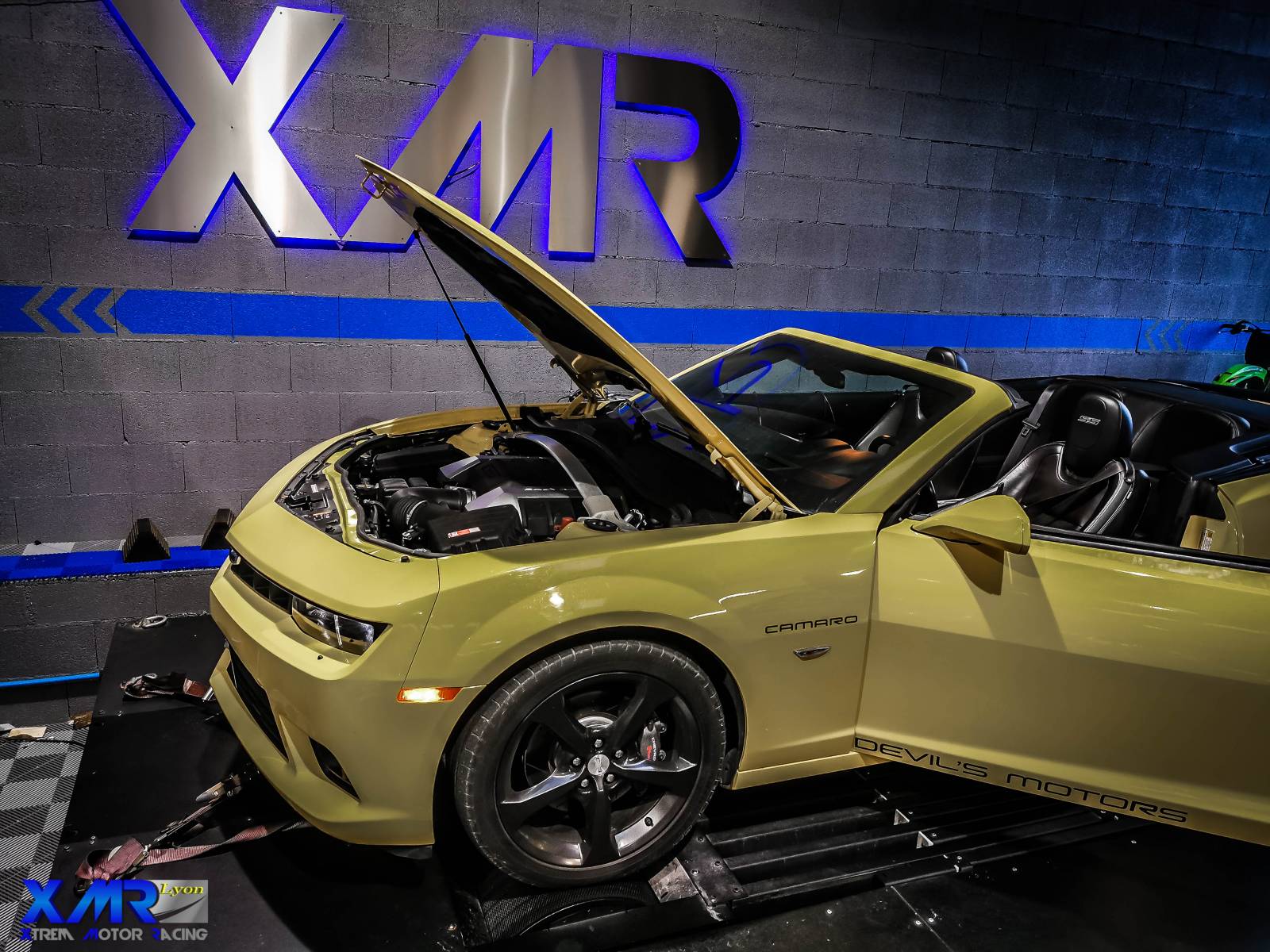 Vue de l'atelier de XTREM MOTOR RACING à LYON, spécialisé dans l'optimisation moteur de véhicules de haute performance comme la BMW 135i.